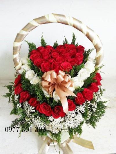 Giỏ hoa mang chủ đề “Khúc nồng say” được thiết kế nên từ những đoá hoa hồng đỏ, hoa hồng trắng, hoa mimi trắng, cùng nhiều loại hoa trang trí khác. Với ý tưởng thiết kế độc đáo, sự tinh tế trong cách chọn và phối các loài hoa nên giỏ hoa trở thành món quà đặc biệt trao gửi thông điệp yêu thương cao cả.